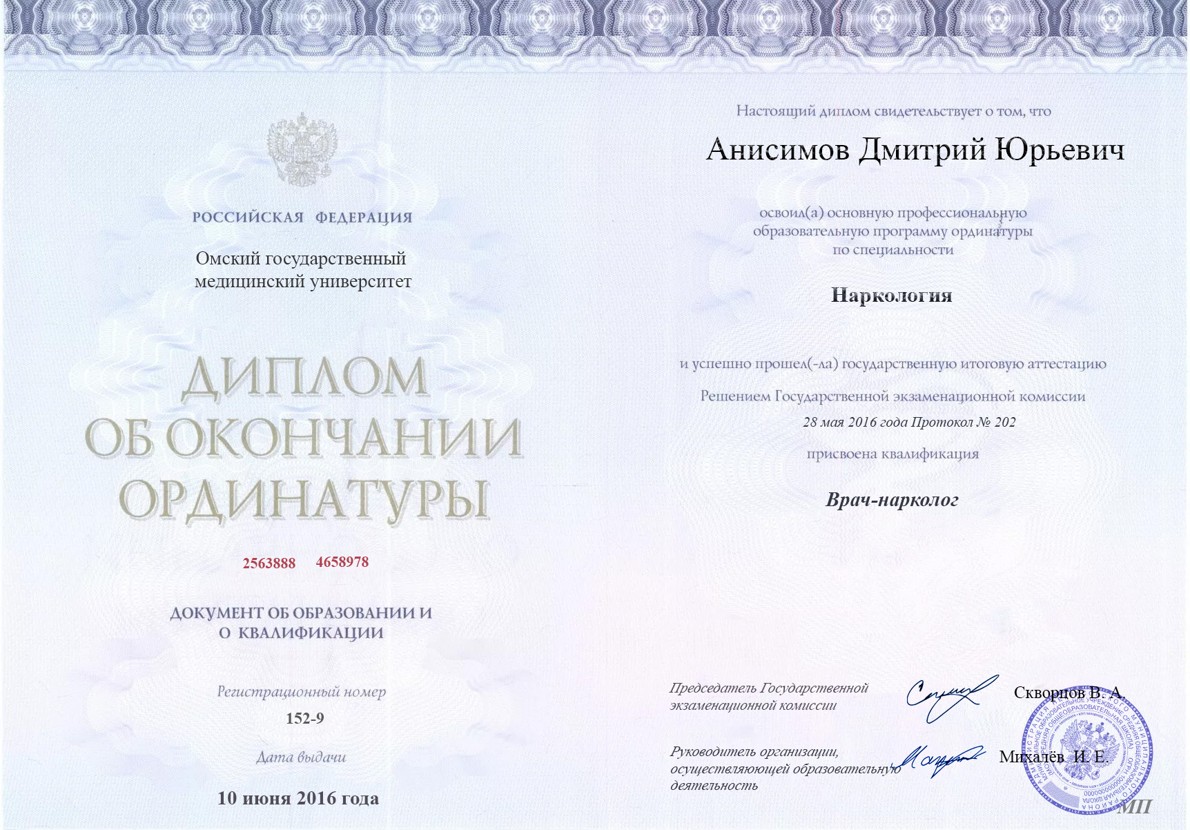 Анисимов Дмитрий Юрьевич — опытный врач-нарколог с 8-летним стажем работы. Окончил Омский государственный медицинский университет в 2014 году, получив диплом по специальности «Лечебное дело». В 2016 году полкучил диплом ординатуры по наркологии.